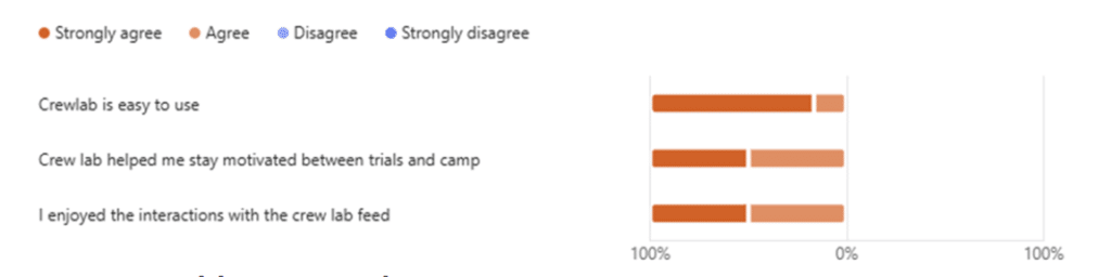 Survey responses showed athletes “enjoyed the interactions with the CrewLAB feed” and that it “helped me stay motivated to train.” When 71% of athletes reported feeling supported during remote training periods, they specifically cited “CrewLAB useful tool” as a key factor.